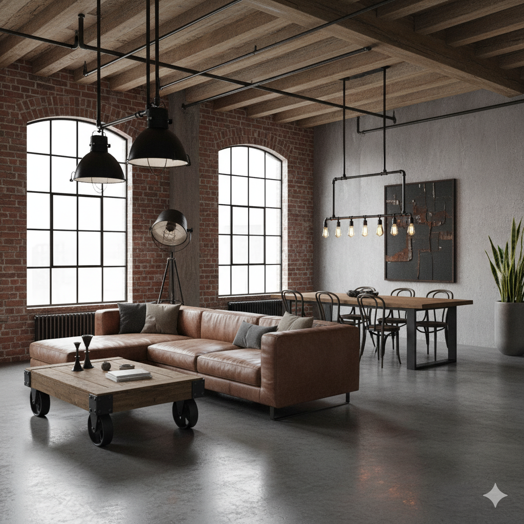 Stilul industrial se bazează pe conceptul de „conversie urbană”. Spațiile sunt ample, deschise, inspirate de vechile fabrici și depozite. Fiecare piesă de mobilier spune o poveste despre durabilitate și inginerie.